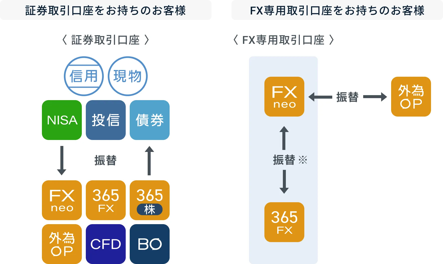 FXネオ取引口座とくりっく365取引口座間で振替が可能です。外為オプション取引口座は、FXネオ取引口座との間でのみ可能です。