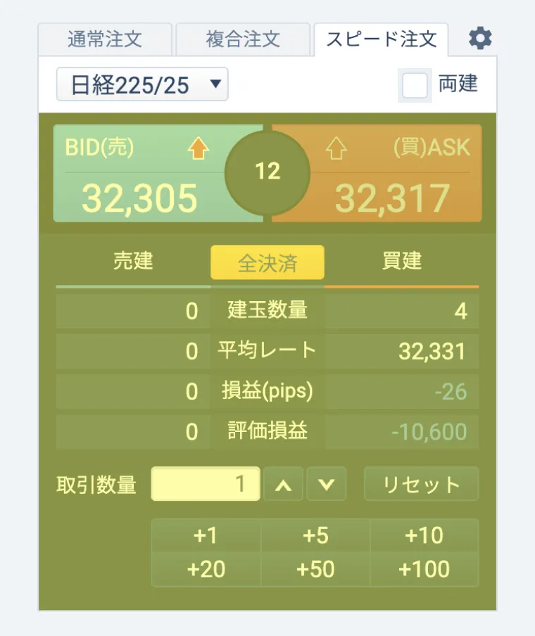 スピード注文とは、1クリックで即時注文が可能な次世代の注文機能です。新規・決済・ドテン・同一銘柄の全決済注文も1クリックで操作できる取引ツールの常識を一変させる次世代の注文機能です。