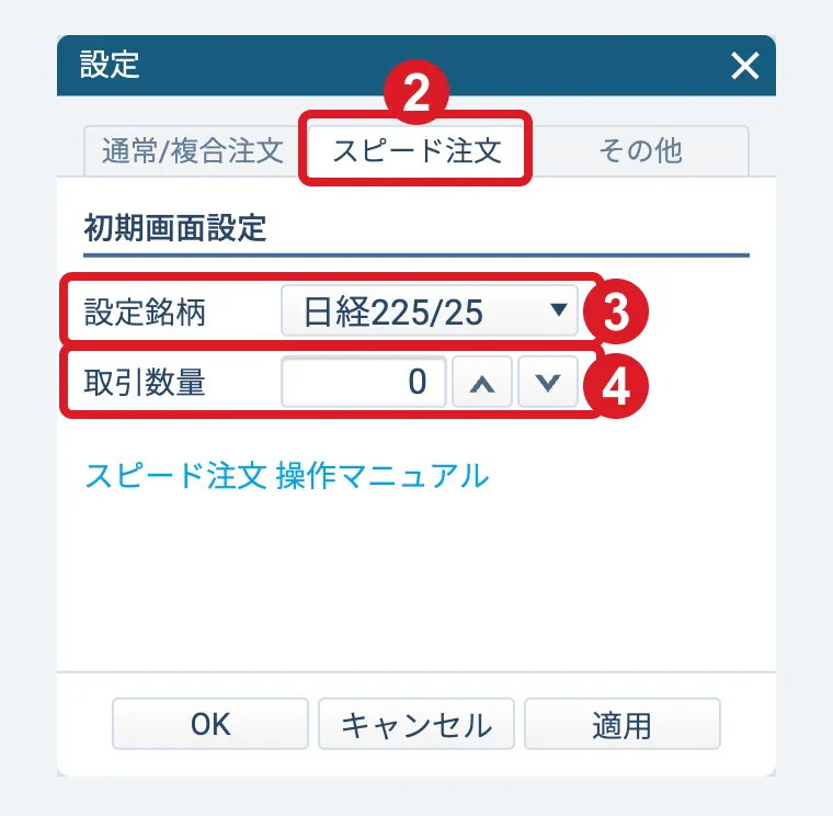 1. 4「スピード注文」を行う際の取引数量のデフォルト値を設定します。