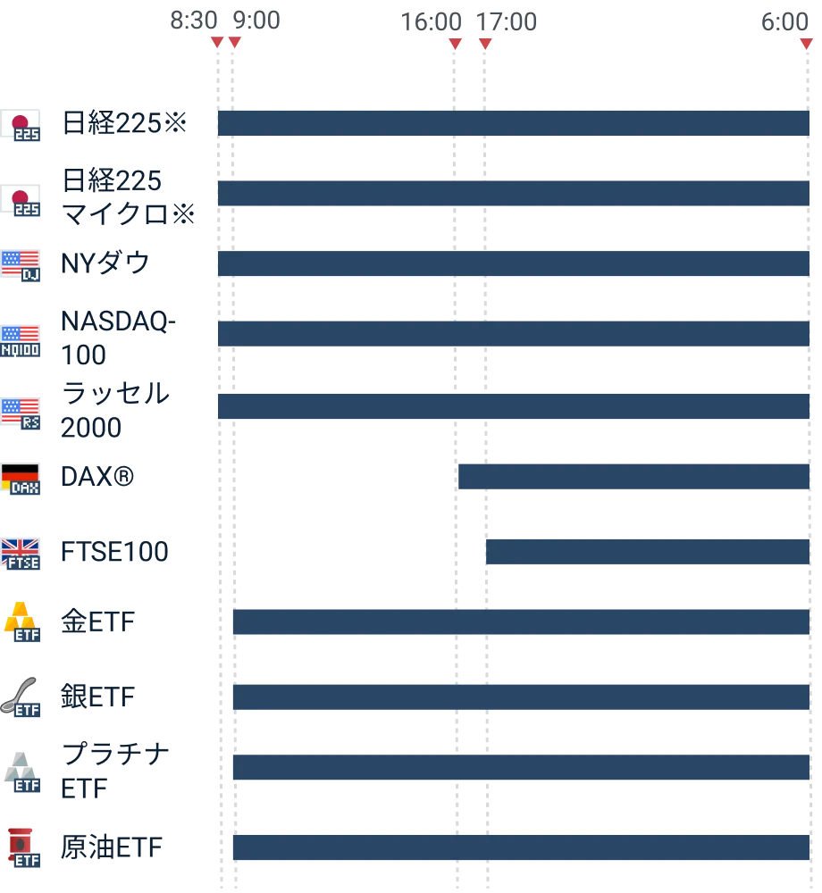 日本の祝日を含め、ほぼ24時間、日経225やNYダウなどの主要株価指数や商品ETFのレバレッジ取引が可能
