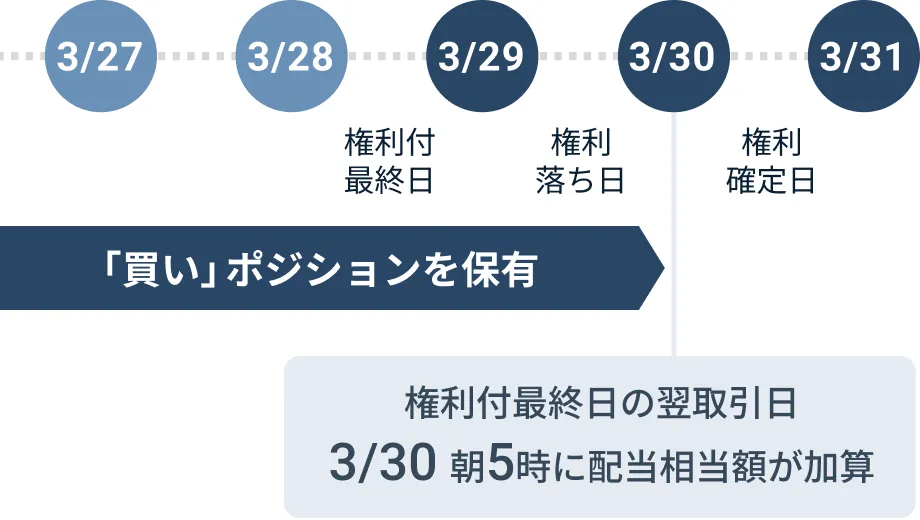 - 権利付最終日と同じ取引日の終了時に買いポジションを保有していれば、翌取引日に配当相当額がポジションの評価額に加算されます。(売りポジション保有の場合は、同額が減算されます)