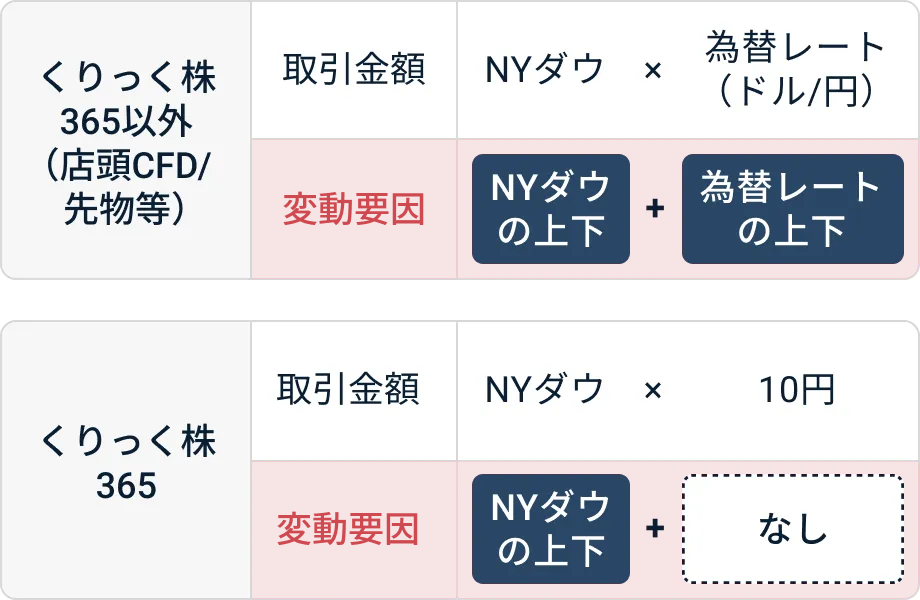 - 通常、海外投資においては、原資となる日本円を現地通貨に交換する必要があり、その交換比率である「為替レート」の変動リスクがあり、為替手数料もかかります。「くりっく株365」なら、各株価指数を円貨で取引することが出来るため、自分のポジションの損益額がわかりやすく海外投資の初心者にも取引しやすい仕組みとなっています。
