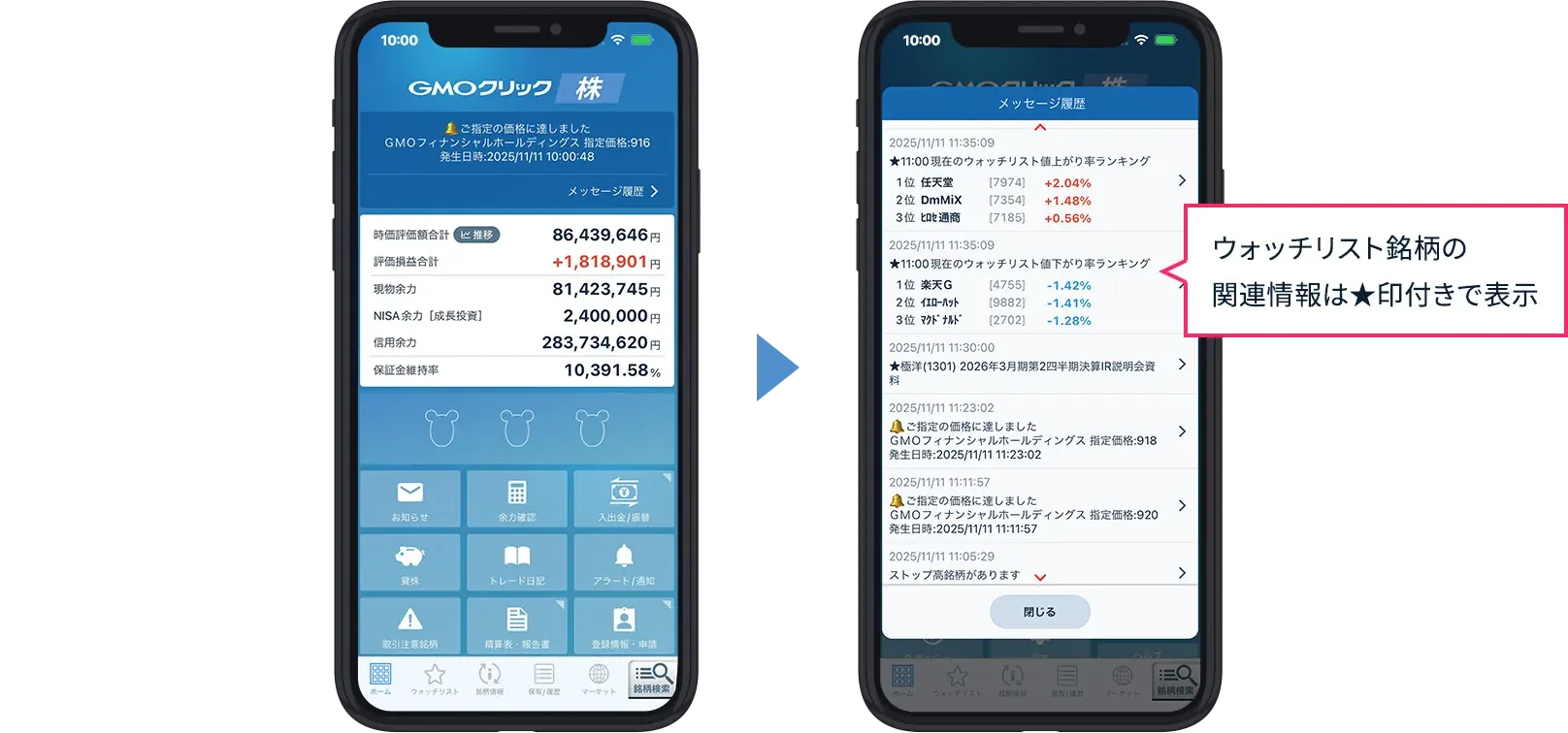 市場全体の動きはもちろん、ウォッチリストに銘柄を登録するだけで、その銘柄についての新着ニュースやランキング、ストップ高/安情報などが自動で表示されるようになります。