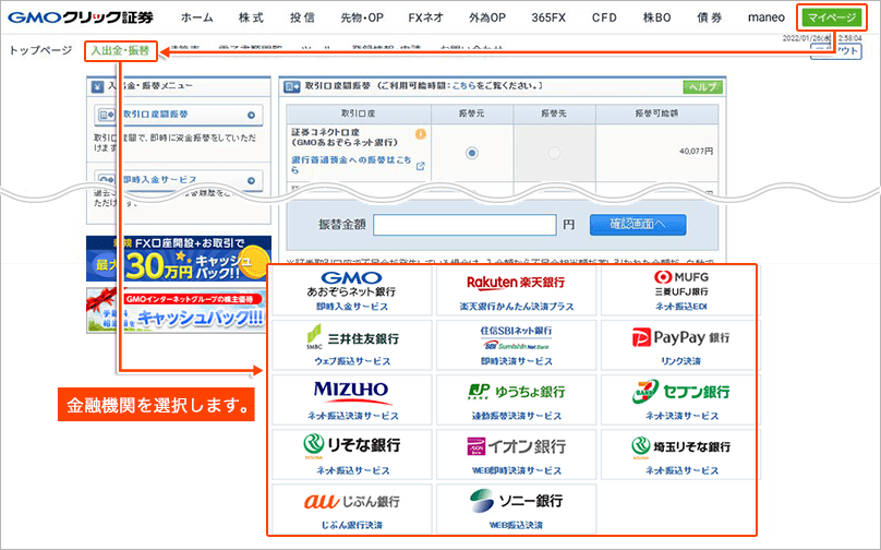 • 振込先口座はGMOクリック証券指定の銀行をご利用いただきます。