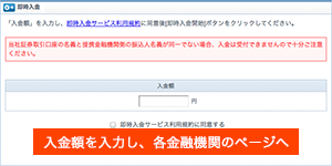 1. 1 会員ページ【マイページ】-【入出金・振替】の「即時入金サービス」からご利用の金融機関サービス名を選択してください。即時入金を行う画面が表示されます。