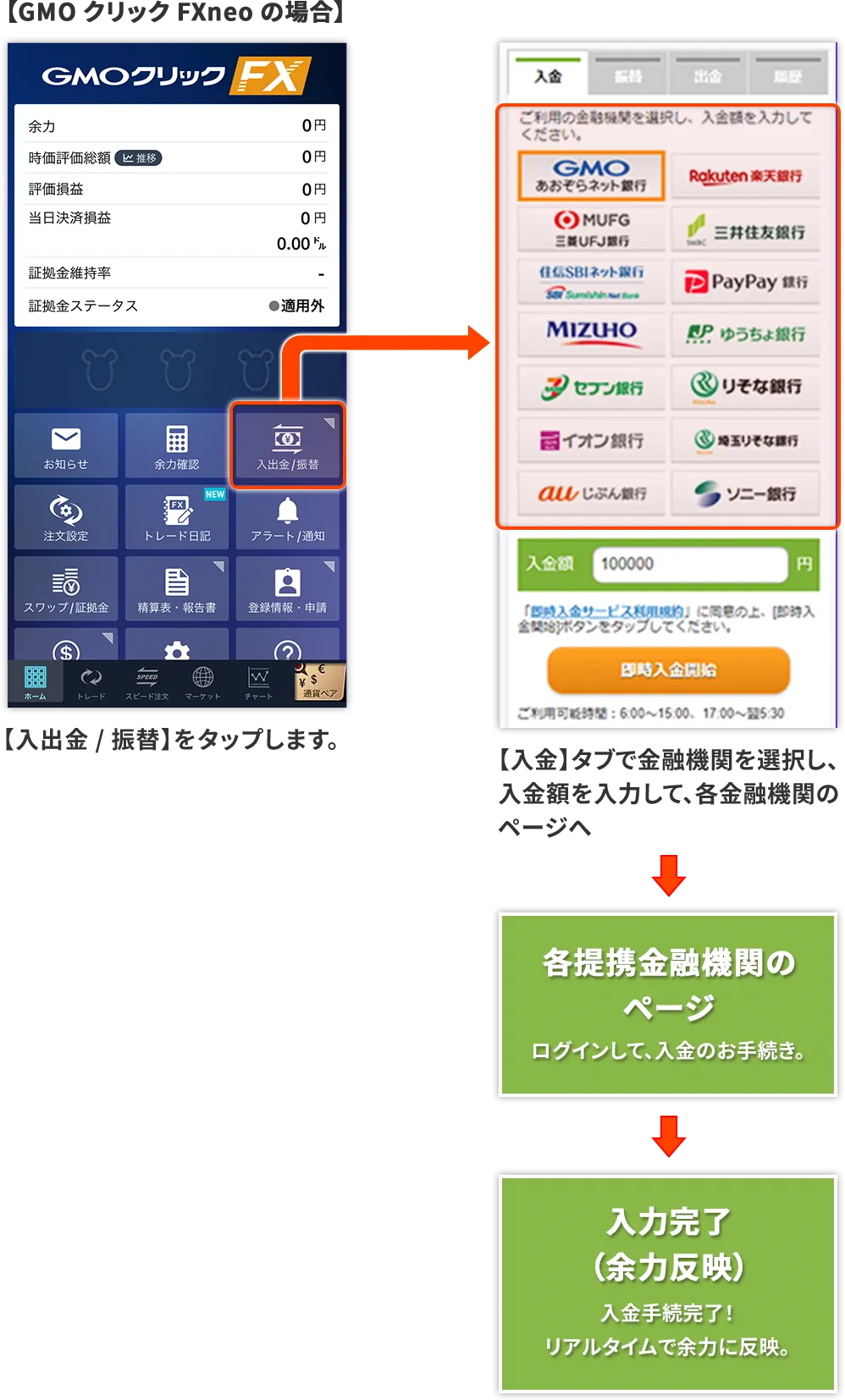 • 正午までの入金が必要となる場合は11:30まで、当日中の入金が必要となる場合は15:00までに入金手続きをお取りください。(これらの時間はGMOクリック証券への振込完了時間となります)