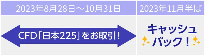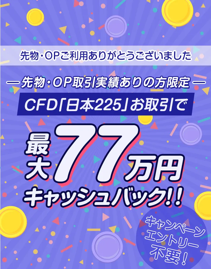 | 概要 | 2022年1月1日~2023年8月25日に先物・オプションの取引実績があるお客様を対象として、CFD「日本225」銘柄の1CFDにつき5円をキャッシュバックいたします。 |