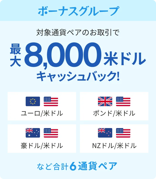 [ボーナスグループ]対象通貨ペアのお取引で最大8,000米ドルキャッシュバック!ユーロ/米ドル、ポンド/米ドル、豪ドル/米ドル、NZドル/米ドルなど合計6通貨ペア