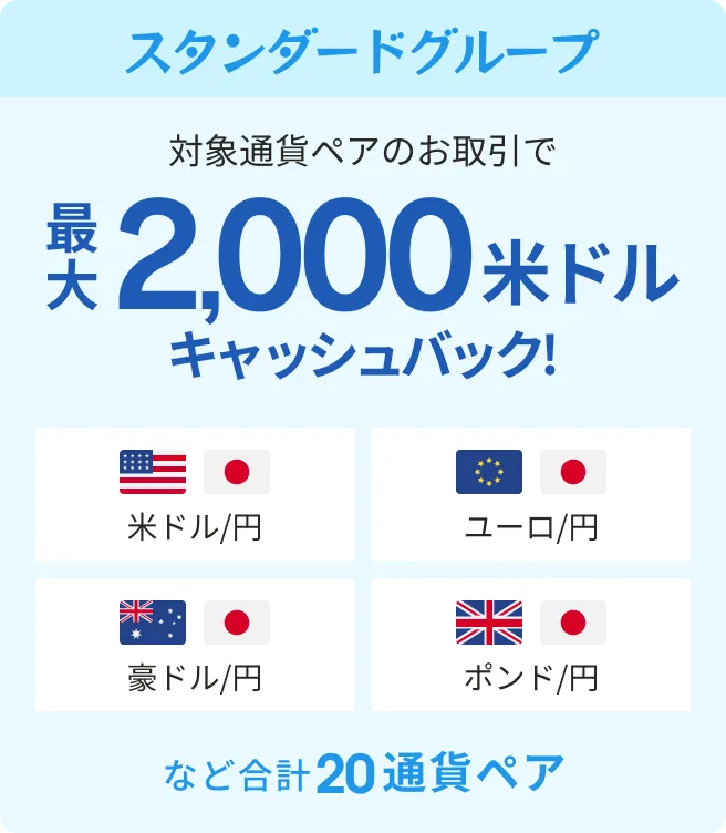 [スタンダードグループ]対象通貨ペアのお取引で最大2,000米ドルキャッシュバック!米ドル/円、ユーロ/円、豪ドル/円、ポンド/円など合計20通貨ペア