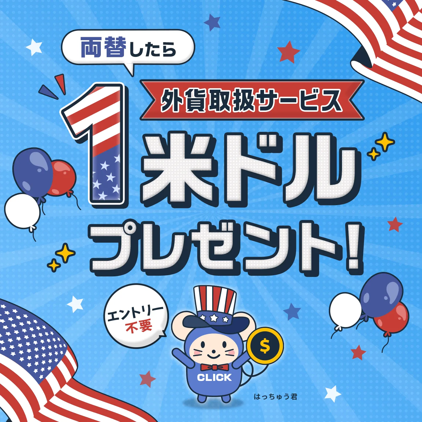 取引達成期間中に日本円から米ドルへ両替をすると、1米ドルをプレゼントいたします。