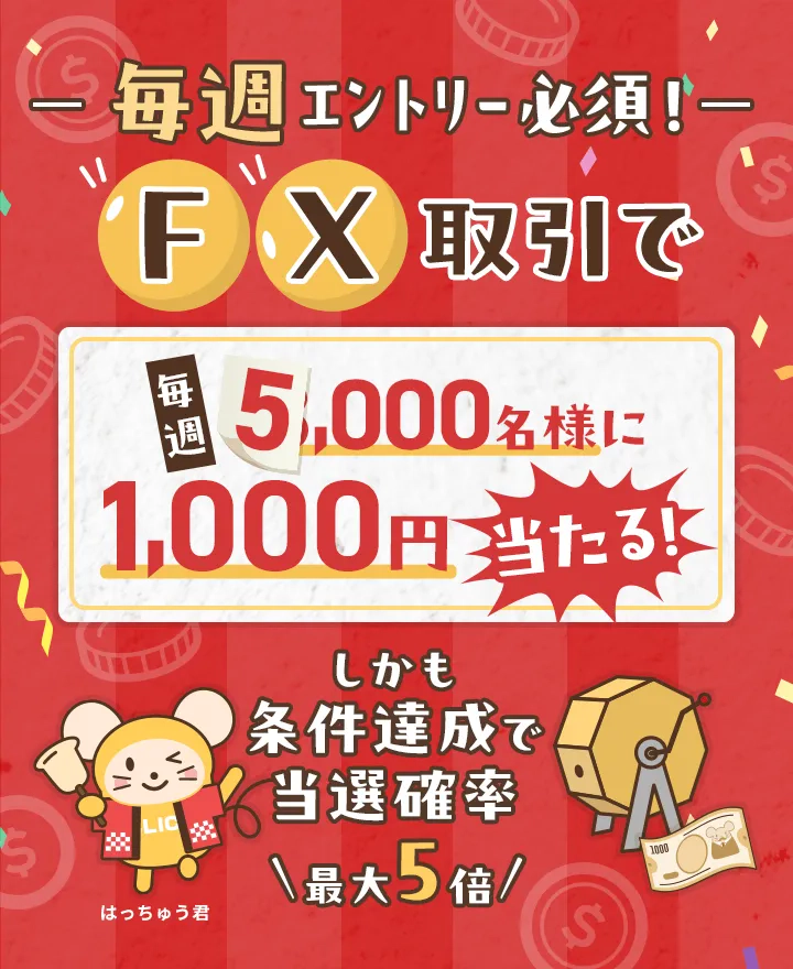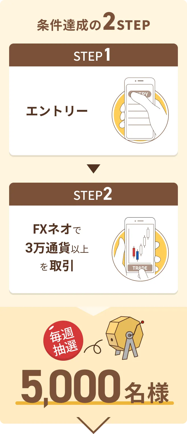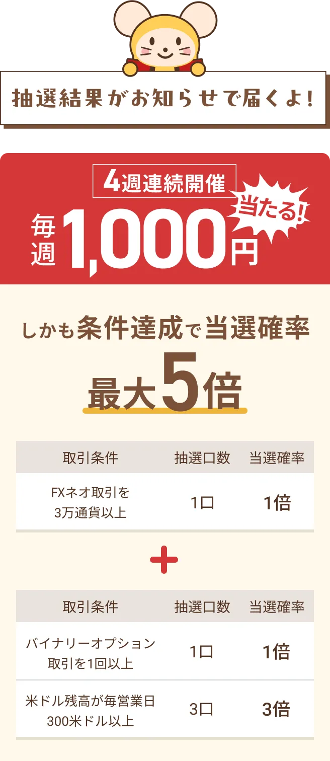 各開催週にFXネオで3万通貨以上お取引されたお客様の中から、抽選で毎週5,000名様に1,000円をプレゼントいたします。