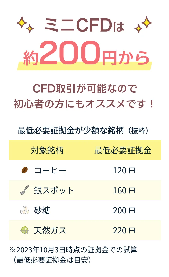 2023年9月11(月)約定分より、主要なCFD銘柄の最小取引単位数量を0.1枚に引き下げ、より少額でのお取引が可能になりました。詳しくはこちらをご覧ください。