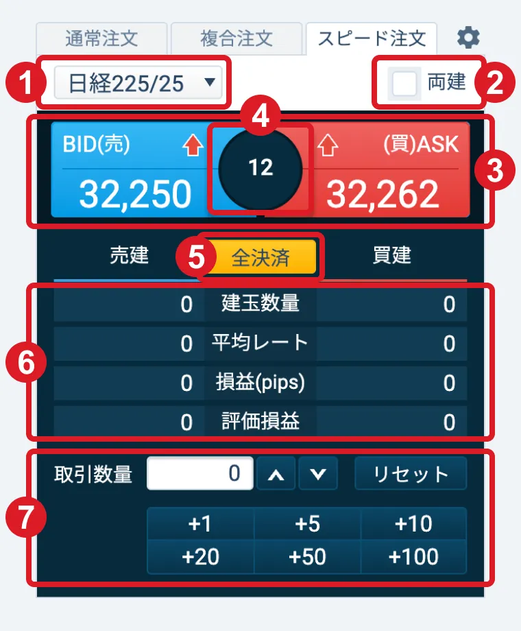 - 4「スピード注文」を行う際の取引数量のデフォルト値を設定します。
