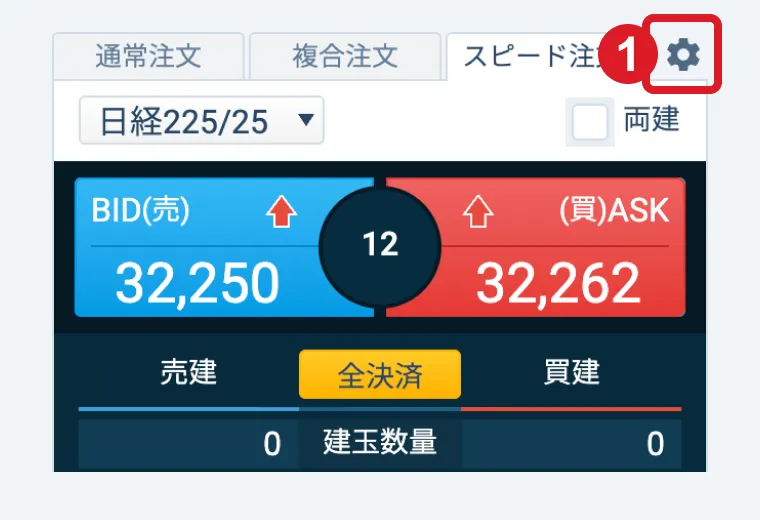 - 1PC会員ページから設定する際は、注文パネル右上の[設定]ボタンを押してください。