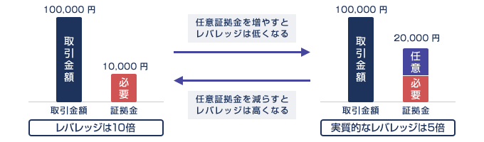 • 買建て玉の任意証拠金は、必要証拠金との合計が取引金額を超えない範囲(レバレッジが1倍未満にならない範囲)で割り当てることができます。