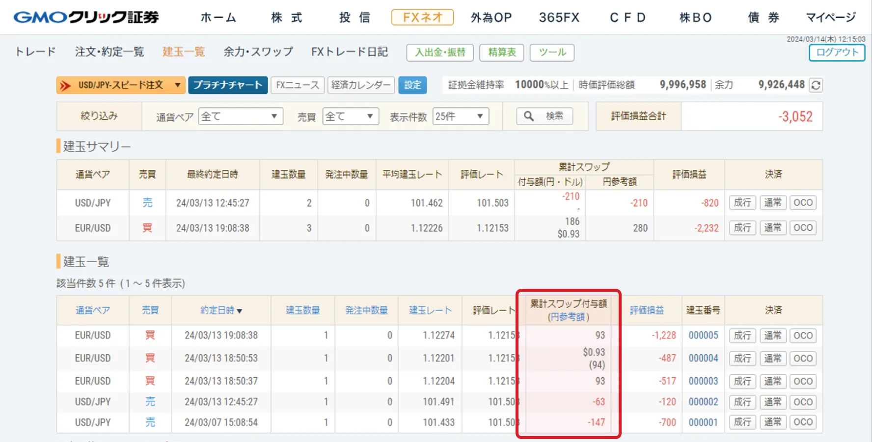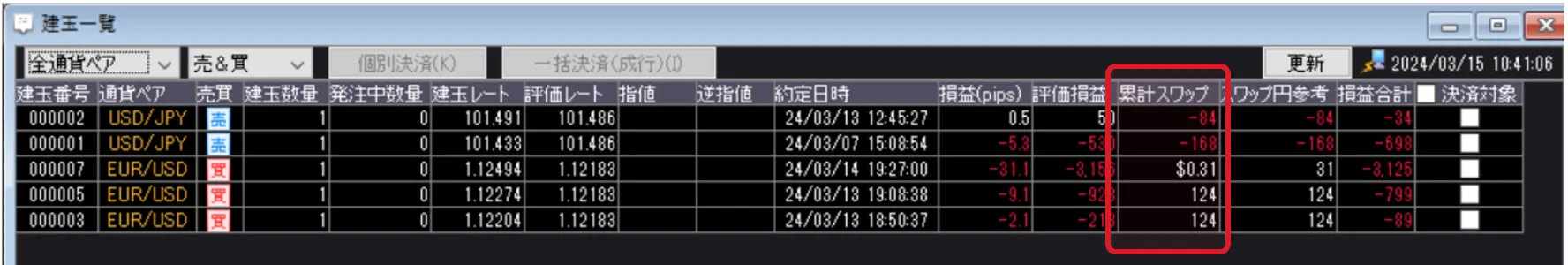 - 2スワップポイント付与後、建玉一覧画面でスワップポイントが確認できます。