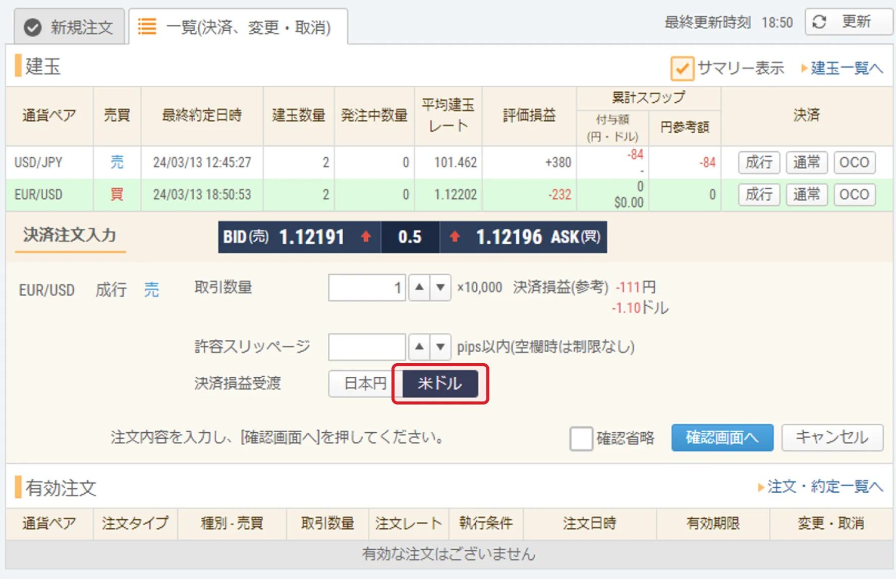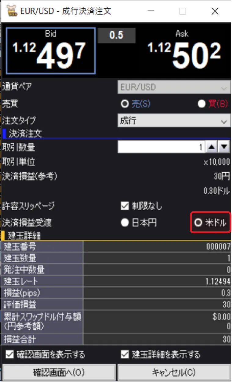 - 1対象通貨ペアのポジション決済画面にて、【決済損益受渡】選択を「米ドル」にすることで決済損益を米ドルを受け取ることができます。