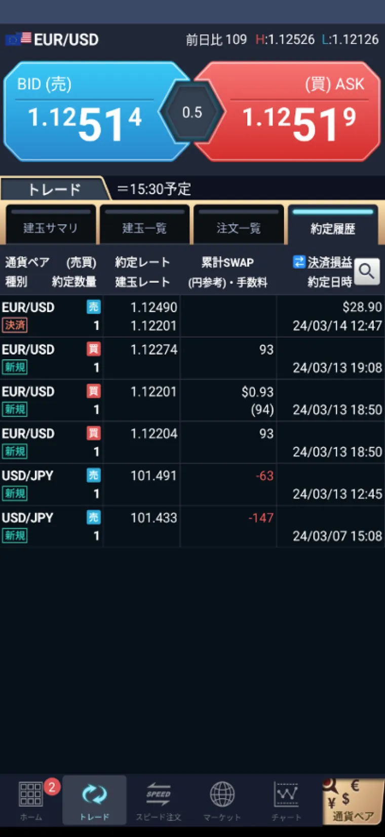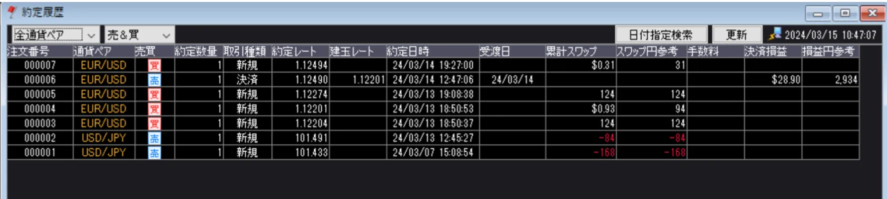 - ●【FXネオ】-【トレード】-【約定履歴】を確認