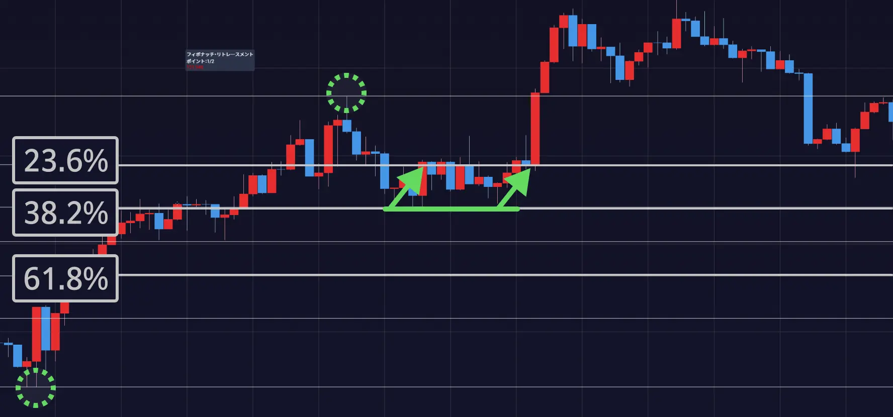 フィボナッチを活用して、押し目や戻り目の目安を確認したら、実際に価格がフィボナッチ比率のラインで反発するかに注目します。押し目のケースだと、下落途中で買いポジションをとるような動きだと、逆張りの買いという形になりますが、フィボナッチリトレースメントを活用する際は、23.6%、38.2%、61.8%のラインなどで下げ止まるのを確認、反発後に順張りでの取引を行うことが効果的です。上昇トレンドで押し目を作っている際は、下落の勢いが弱くなり停滞していると反発して再び上昇して行くケースが多いため、フィボナッチ比率のラインで価格が停滞している場合は、トレンドに合わせて順張りエントリーします(上昇トレンドの場合は買い、下降トレンドの場合は売り)。