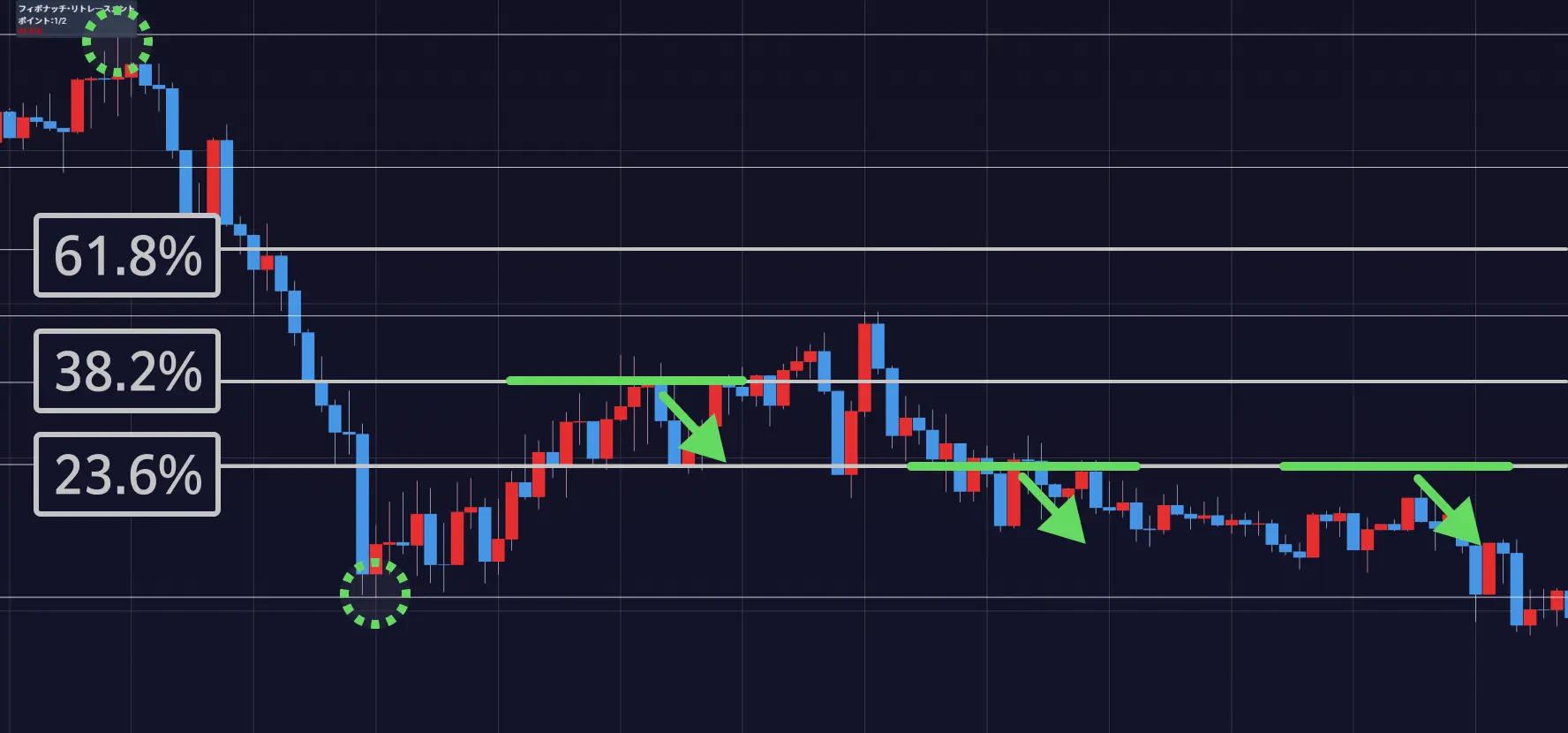 理論的には押し目買いの水準まで待っての押し目買い、戻り売り水準まで待っての戻り売りが理想的ですが、上昇トレンドが継続している場合は買い、下降トレンドが継続している場合は売りのエントリーを行ってしまい、同水準が天井、天底だったということも考えられます。その場合、フィボナッチリトレースメントを引いて、「23.6%」「38.2%」「61.8%」などのラインで価格の下落(上昇)が止まらない場合はトレンド転換としてさらなる下落(上昇)が待っているケースが考えられます。あくまでフィボナッチ比率を念頭に置いた取引になるため、その際は含み損の保有ポジションを損切りする判断をしましょう。