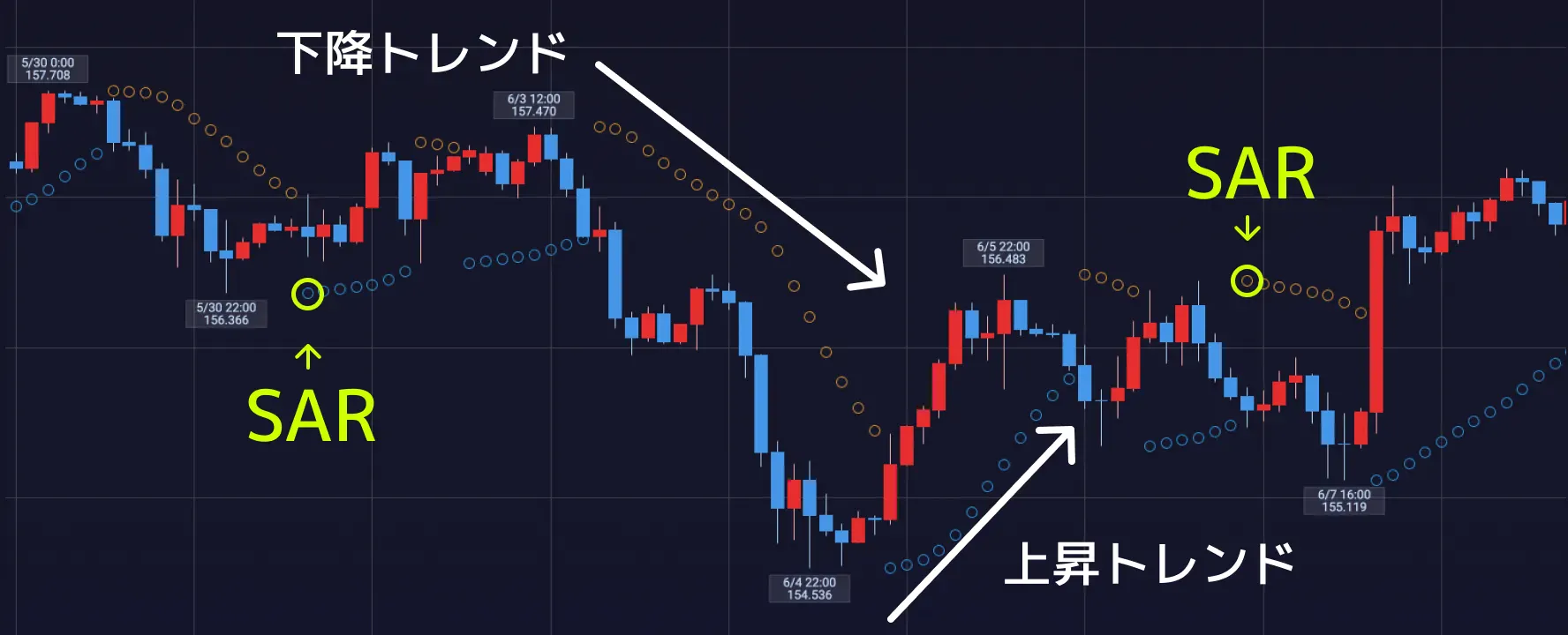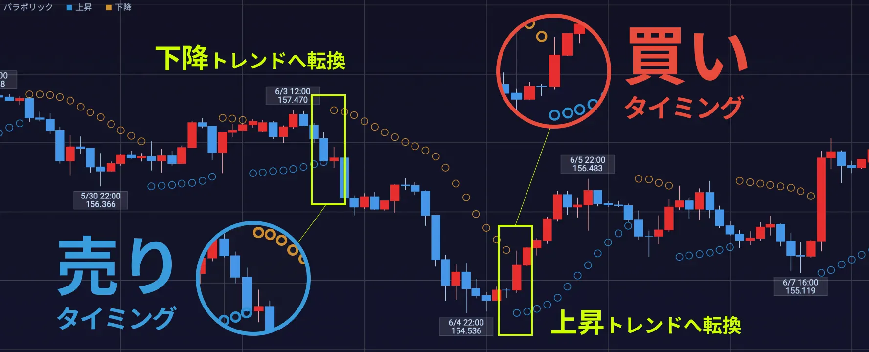 また、エントリー以外で売買サインとなるのが転換点と呼ばれるポイントですが、これは、上昇しているSARが下降のSARになった場合、下降しているSARが上昇になった場合の状況を指し、基本的にはSARがローソク足にタッチしたタイミングが転換点と呼ばれるポイントになります。