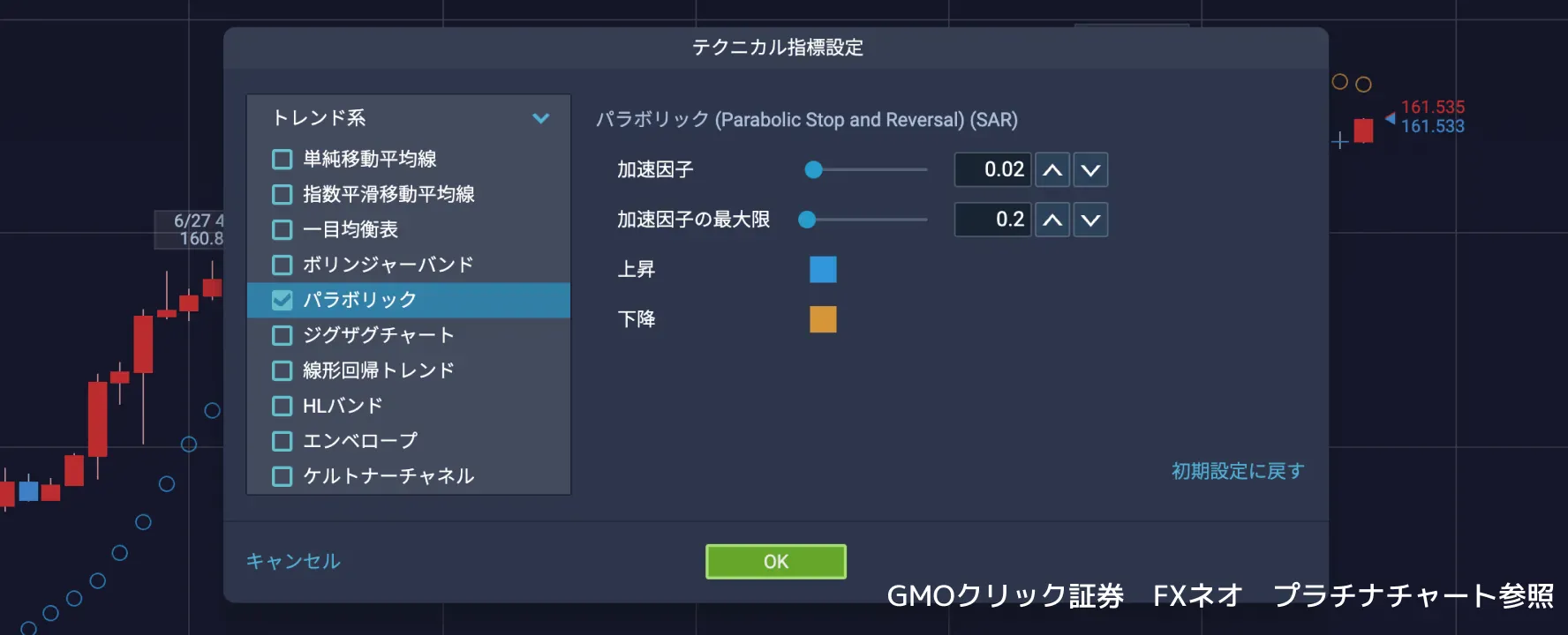 提供されているパラボリックでは、設定値として「加速因数」などの値を設定する箇所があります。加速因数の設定を変えることにより、感度を高くしたり(加速因数を大きくする)、鈍くしたりする(加速因数を小さくする)ことができます。この設定値によっては、「だまし」が多くなる場合や、相場に敏感に反応せずにタイミングが遅れてしまうことがあるため、基本的にはデフォルト設定値(0.02が設定されているケースが多い(最大値は0.2))を推奨します。