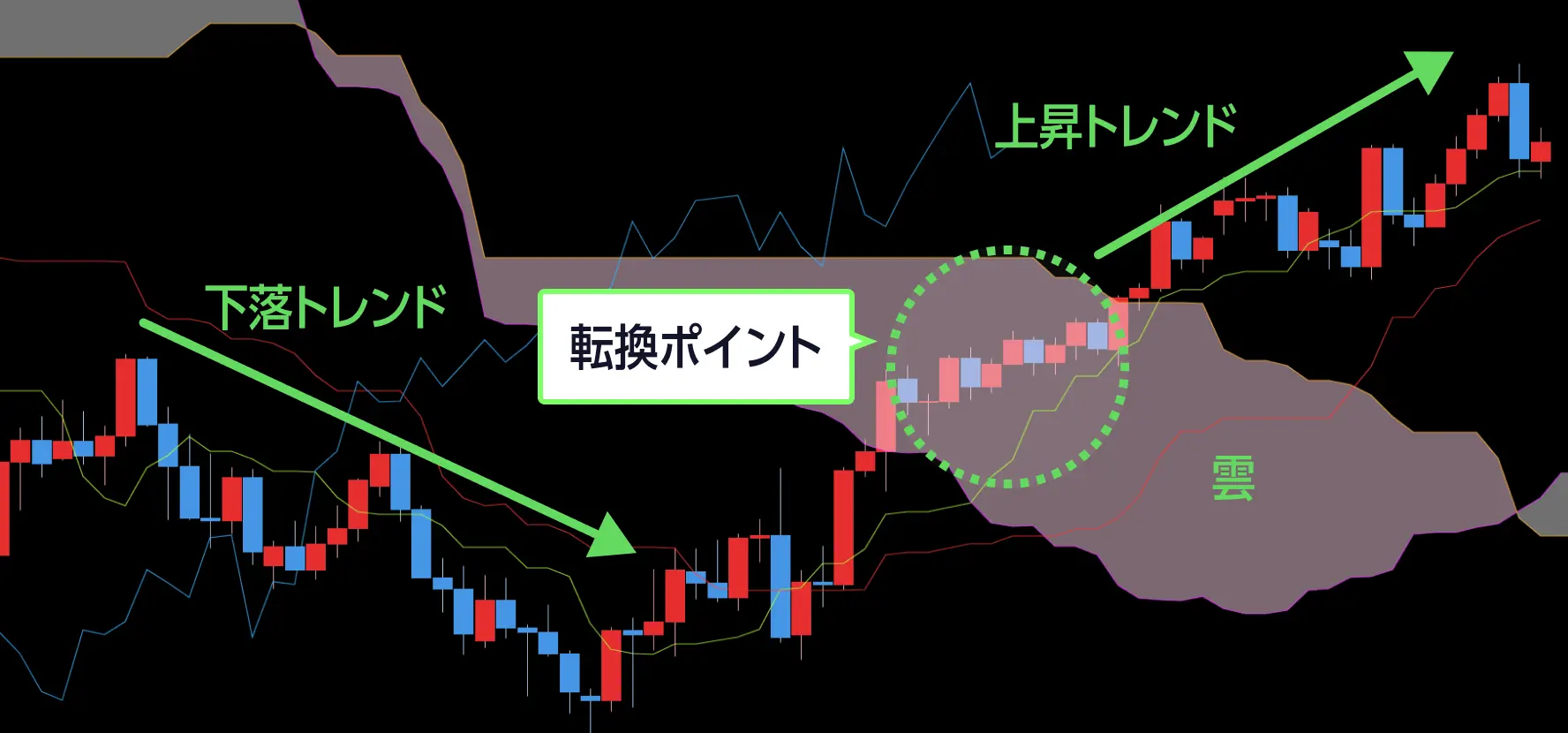 一目均衡表には『雲』と呼ばれる帯があります。ローソク足が雲の中を推移している状況は膠着状況、つまり持ち合いの状況を指します。また、この雲の上限を上抜ける、雲の下限を下抜けるような動きがあると、相場に方向性が出てきたと判断します。雲の幅が広ければ相場が反転しづらく、逆に狭ければ反転しやすいと見ます。