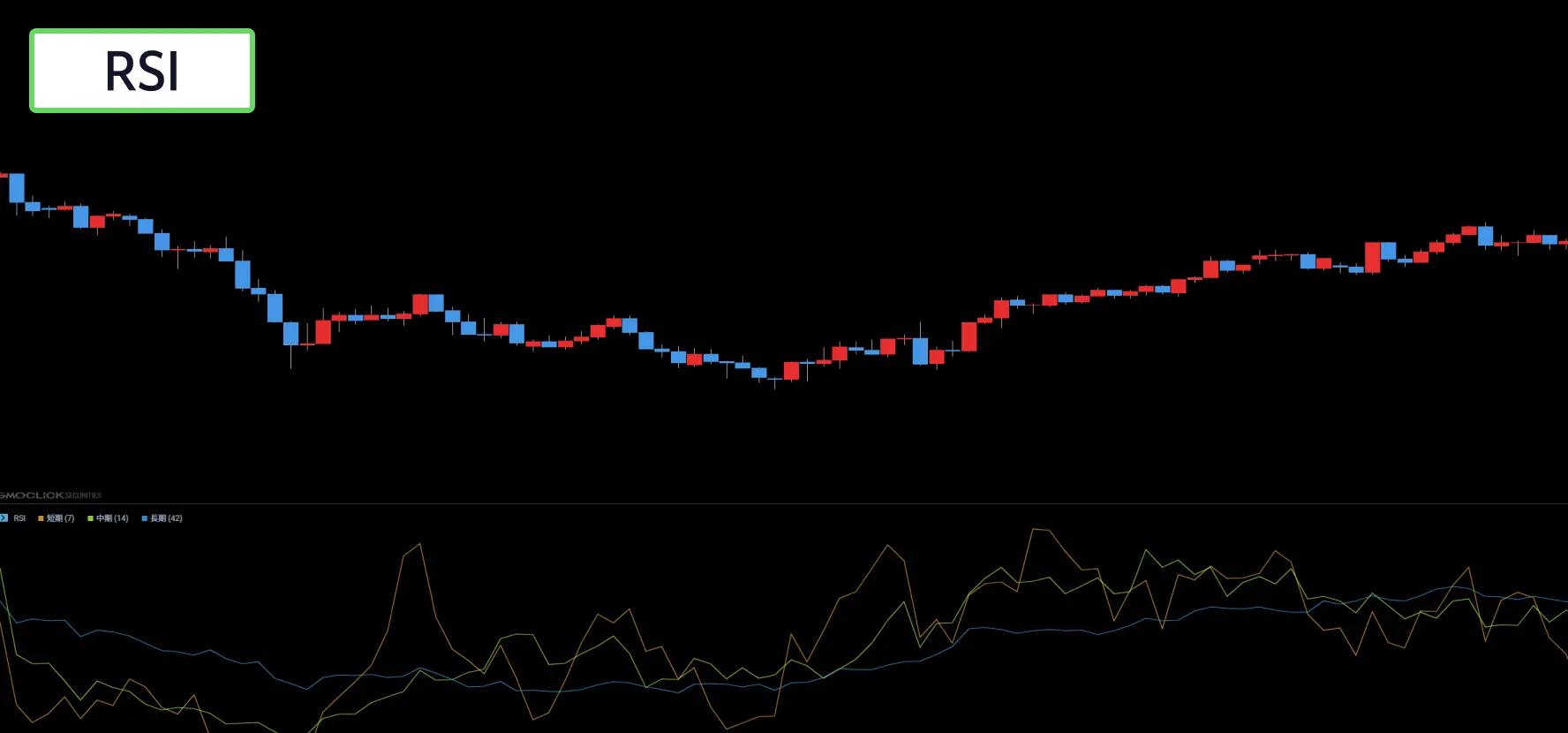 RSIとは、過去の一定期間の値動きに対して、買われ過ぎ・売られ過ぎを数値化しグラフで表示したものです。買われ過ぎ・売られ過ぎを判断する最も有名なオシレーターのテクニカル指標であり、数値は0~100%で表されます。一般的に数値が70%以上で買われ過ぎ、30%以下で売られ過ぎとなり相場の反転サインと判断します。50%付近は持ち合い相場となるため、新規ポジションを考えている場合は、一旦様子見したほうがよいかもしれません。