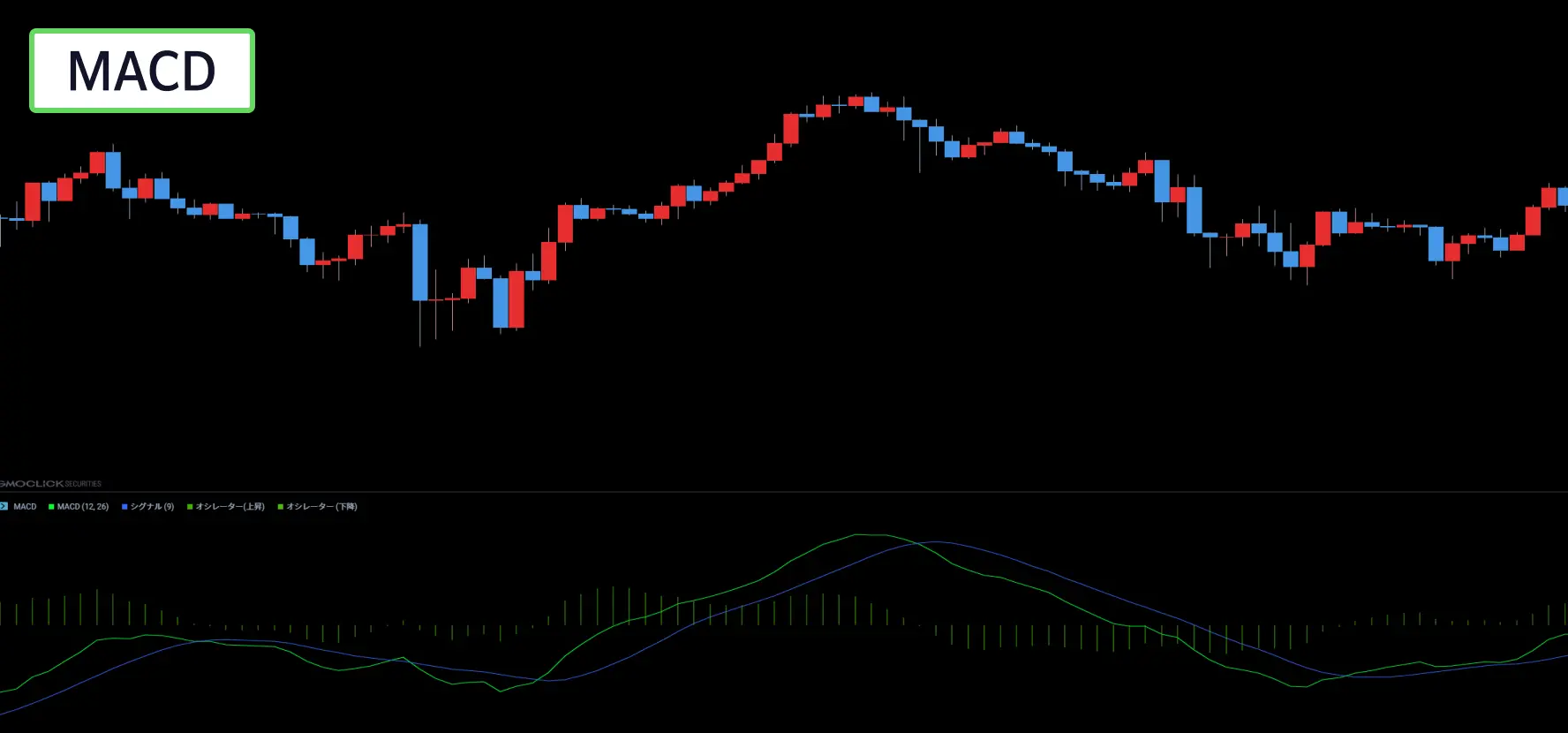 MACD(移動平均収束拡散手法)は、短期移動平均線と中長期移動平均線の差から算出され、買い・売りを判断する手法です。移動平均線より早く買い・売りの判断ができるため、相場の転換をより早く察知するのに有効です。MACDが買いサインを示した後に、移動平均線も買いサインが出れば、強い買いサインであると判断することができます。
