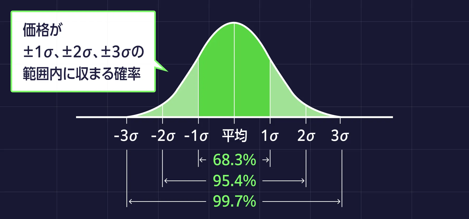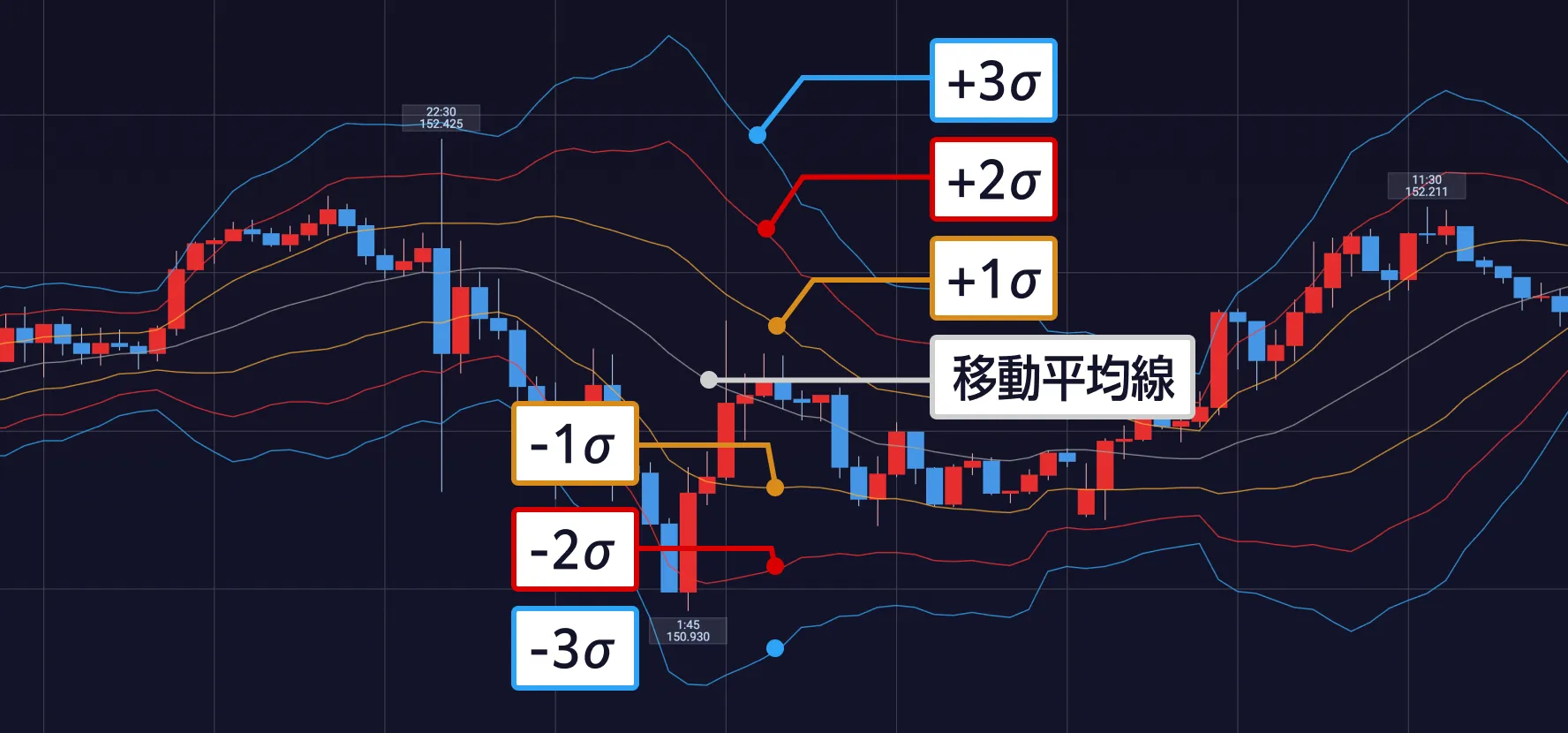 ボリンジャーバンドとは、アメリカのジョン・ボリンジャー氏が考案したテクニカル指標の1つで、価格変動の度合いを表すテクニカル指標です。移動平均線を中心に、標準偏差で計算された「+1σ」「+2σ」「+3σ」「−1σ」「−2σ」「−3σ」という上下の線で構成されます。標準偏差とは、ある一定期間のデータの平均値からどのくらいのばらつきがあるのかを計算した数値であり、上下のバンド幅が広いと価格変動の度合いが高く、狭いと価格変動の度合いが低いと判断します。