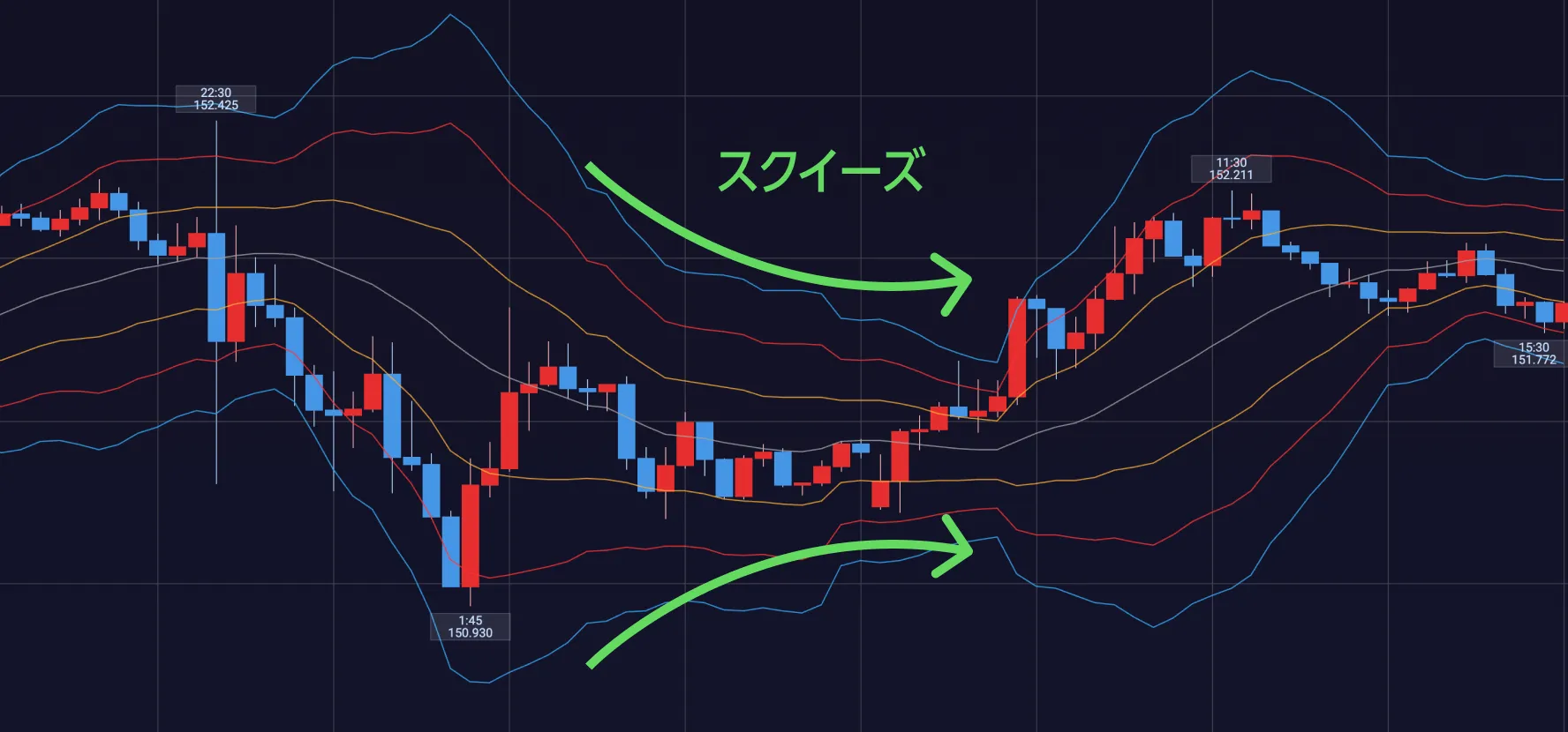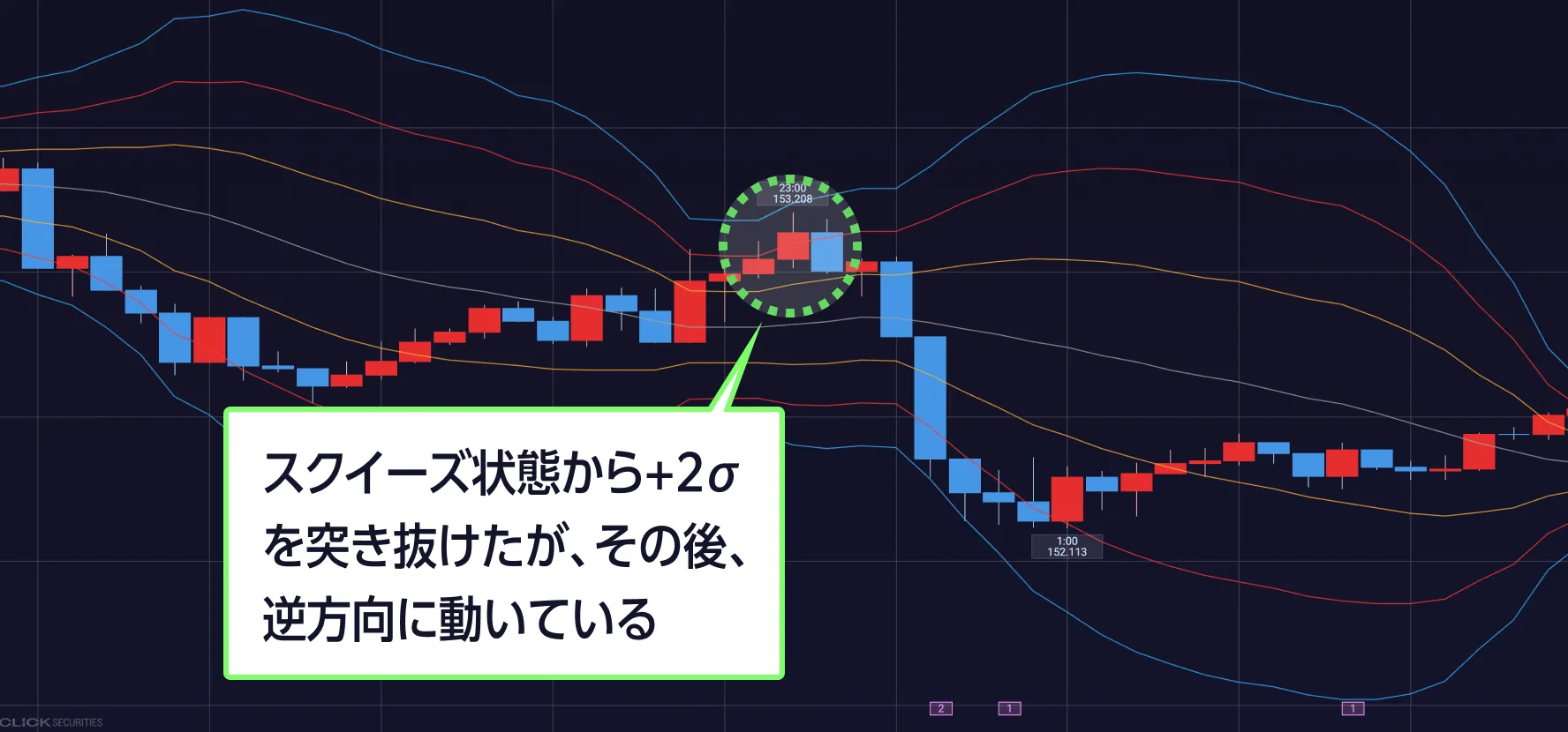ボリンジャーバンドの取引タイミングとしては、上下のバンド幅が狭く絞られて収束しているスクイーズ状態から、ローソク足が±2σを突き抜けた状況が取引タイミングであり、大きなトレンドが発生する可能性があると考えられています。
