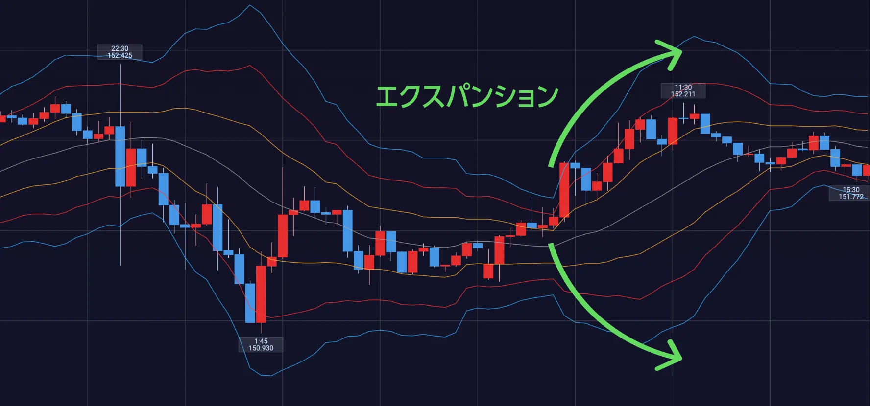 エクスパンションとは、上下のバンド幅が拡大している状態を指します。レンジ相場からの脱却状態を意味しており、どちらか一方向に動くトレンドが発生しやすい傾向にあります。バンド幅が狭く絞られているスクイーズからエクスパンションに移行するタイミングで順張りの買いまたは売り注文を行い、バンドの幅が一番拡大したタイミングで注文を決済することで大きな利益を狙うことを目的とします。