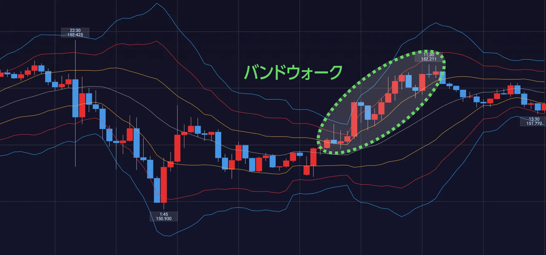 バンドウォークとは、価格が中央の移動平均線まで戻らずに±1σや±2σのバンドに沿って一方方向に動いている状態を指します。バンドウォークは、トレンドが継続しているときに現れる傾向であるため、トレンドが発生している方向へ順張りでの取引を示唆するサインとなります。