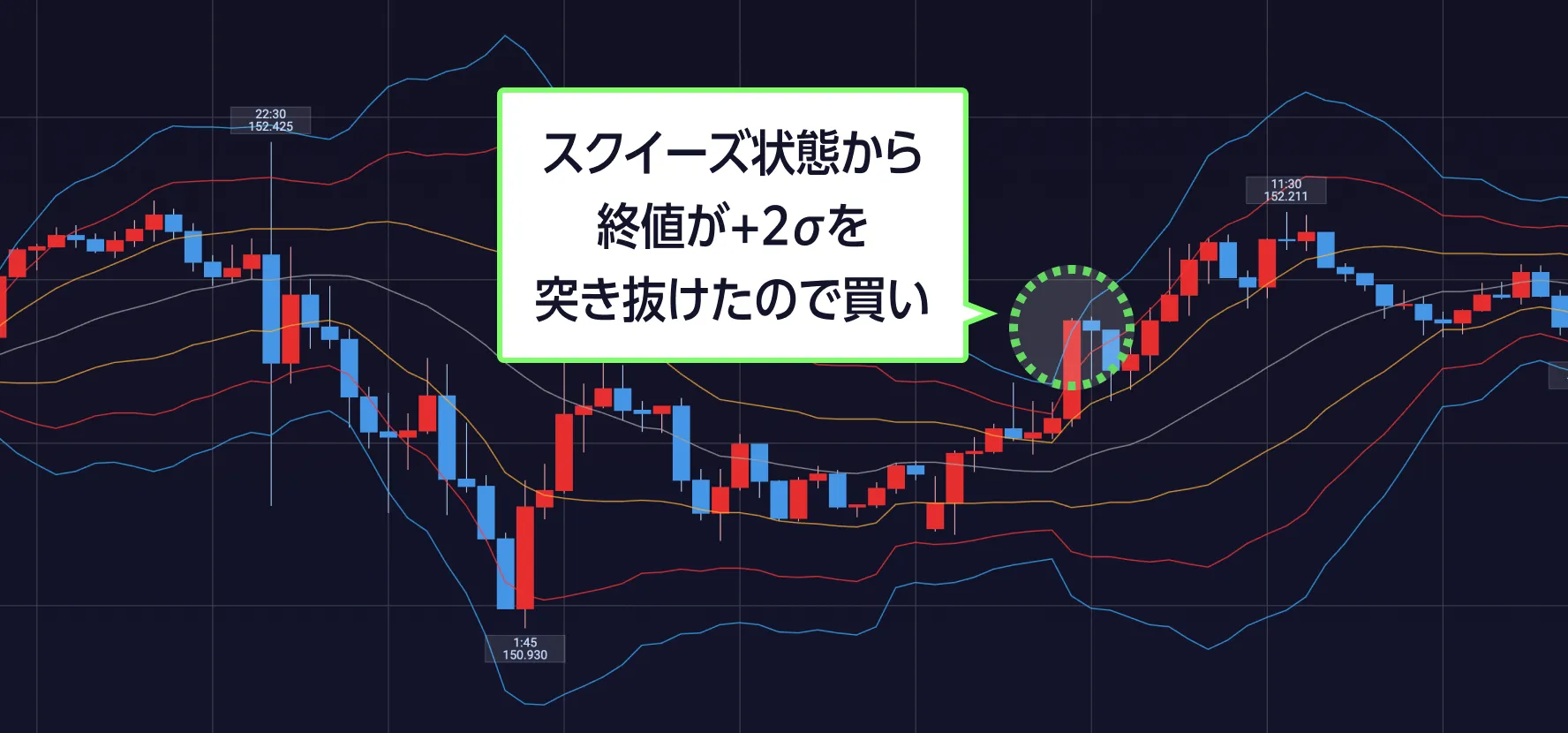 基本的にはバンド幅が広がれば広がるほど大きな値動きが期待できる状態ですが、バンドの幅が狭くなってきたタイミングでの値動きに注目し、終値が±2σをはみ出したら順張りで買いまたは売り注文をし、バンドの幅が最も拡大したタイミングで決済して利益を確定させる取引方法が一般的です。