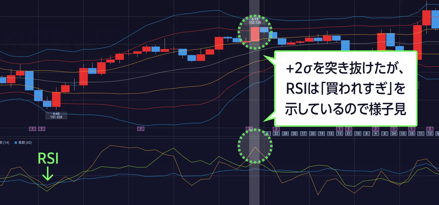 ボリンジャーバンドと組み合わせる場合は、過熱感の把握だけでなく、相場の転換のタイミングや強いトレンドの発生を予測します。ボリンジャーバンドで終値が±2σをはみ出したら順張りという取引方法の場合、RSIが買われすぎ、売られすぎを示唆した場合は、一旦様子見を行うということになりますし、相場の過熱感がここから強くなる場合は、まだまだ上昇、下降余地ありと判断できますので、丁寧に売買サインを確認したい場合は、他のテクニカル指標との併用が有効です。