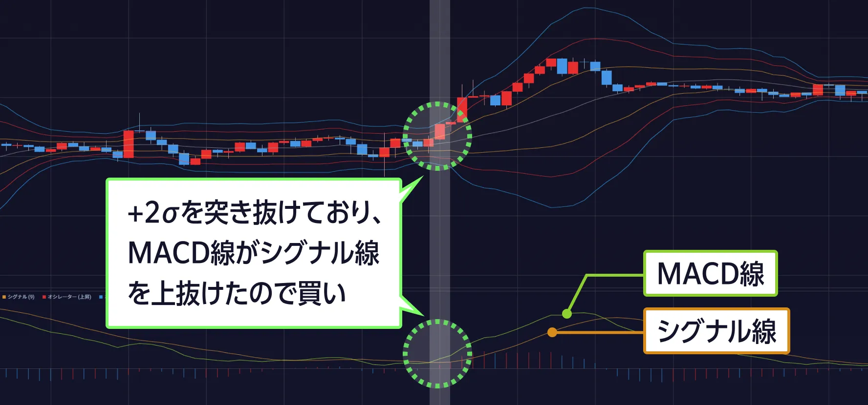 ボリンジャーバンドと組み合わせる場合は、上昇の場合は、+2σからバンド幅が大きくなり、かつ、終値が+2σからはみ出してきているなかで、MACD線がシグナル線を上抜けるような動きの場合は、まだまだ上値余地ありと判断することができます。売りの場合は、買いの場合と逆の考えで活用できます。