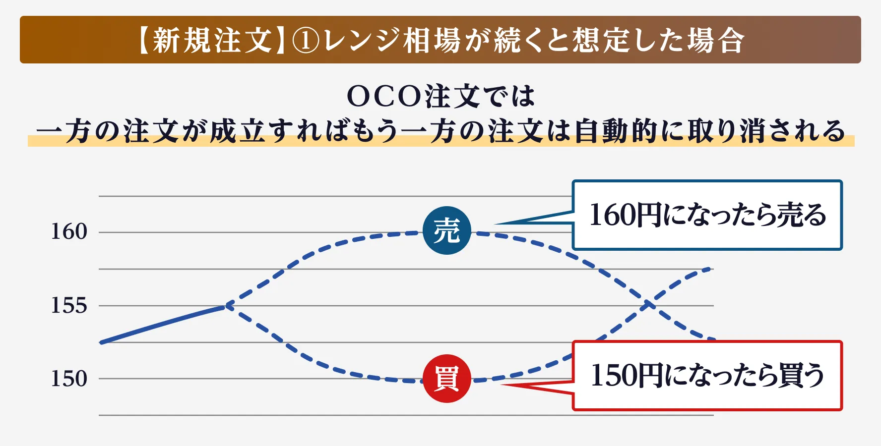 ・仮に米ドル/円が150円に下がったら150円で買い、160円に上がったら売るといった2つの新規注文を同時に発注する