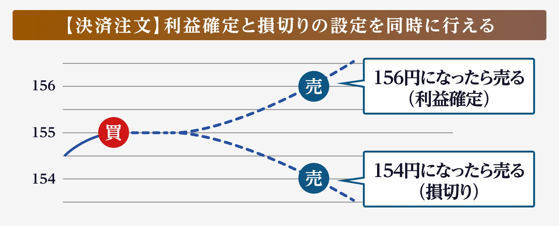 例:1ドル155円で米ドル/円の買いポジションを持っており、「156円になったら利益確定、154円になったら損切り」したいと考えた場合に、「156円で指値注文(売り)」「154円で逆指値注文(売り)」を同時に入れることができる