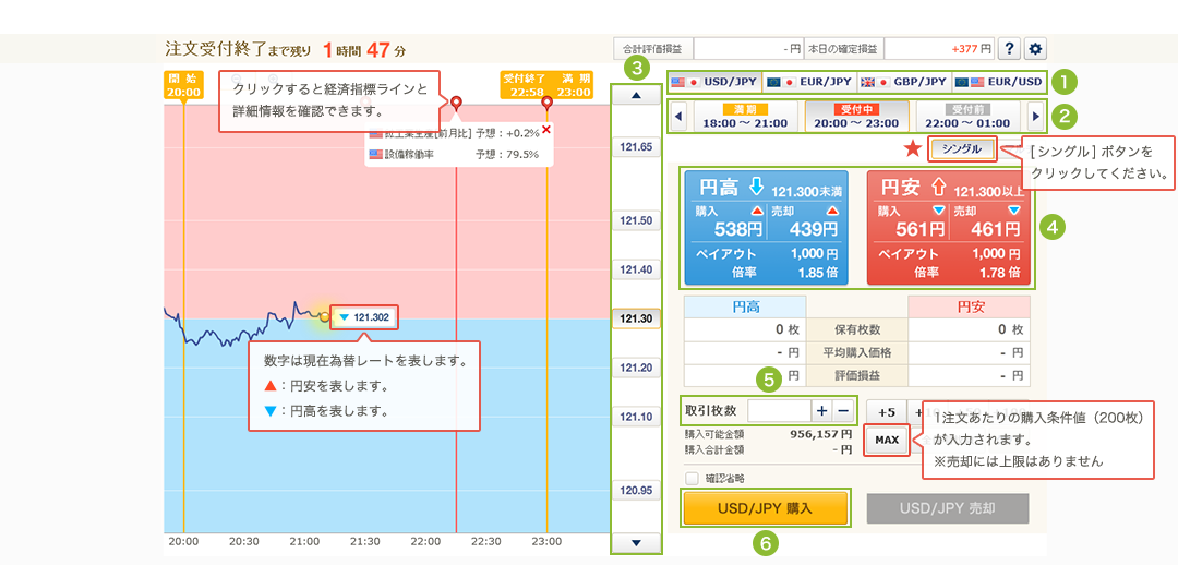 選択した権利行使価格を基準に、為替レートが一定時間後に上昇しているか、下落しているかを予測する取引です。