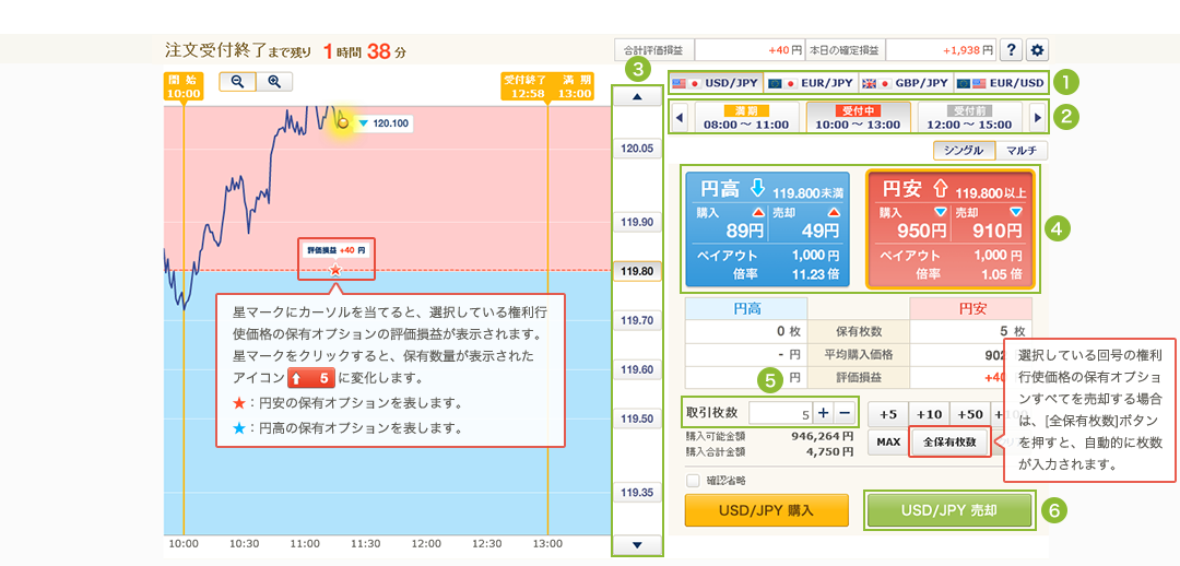 全ての権利行使価格の取引レートを表示しながら取引できます。マルチモードでは、複数の権利行使価格を同時に購入・売却することもできます。
