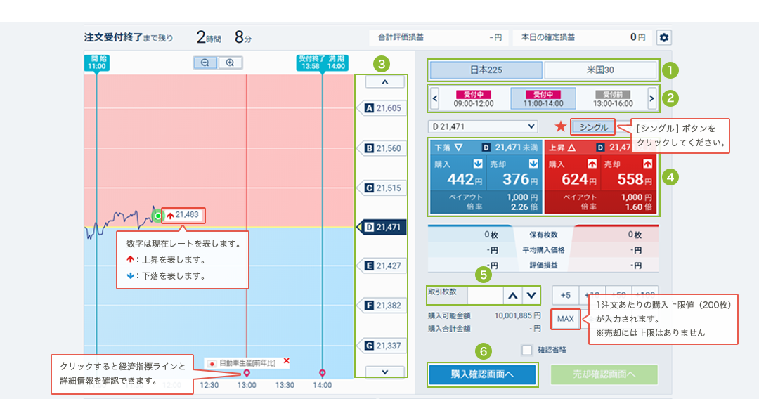 選択した権利行使価格を基準に、原資産レートが一定時間後に上昇しているか、下落しているかを予測する取引です。