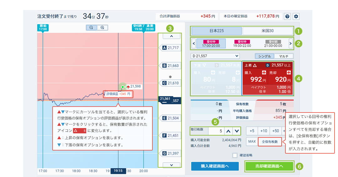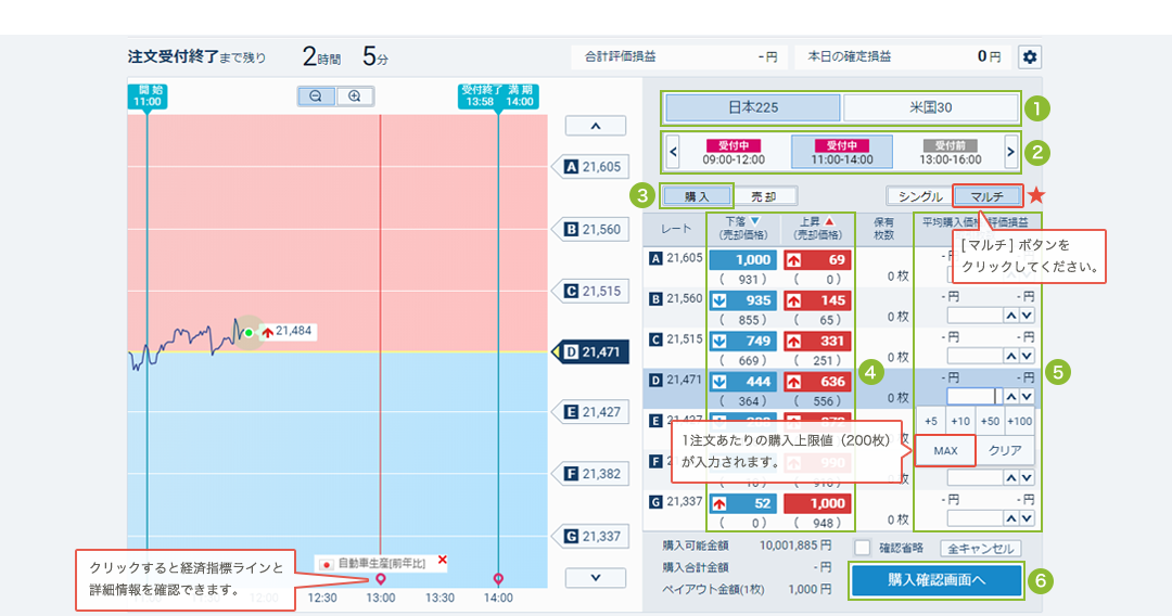 全ての権利行使価格の取引レートを表示しながら取引できます。マルチモードでは、複数の権利行使価格を同時に購入・売却することもできます。