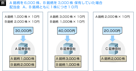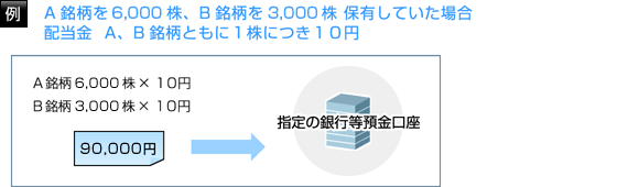 ご所有のすべての株式等について、各証券会社等にお預け入れの株式数に応じた配当金を、それぞれの証券会社等の口座で受け取る方式です。