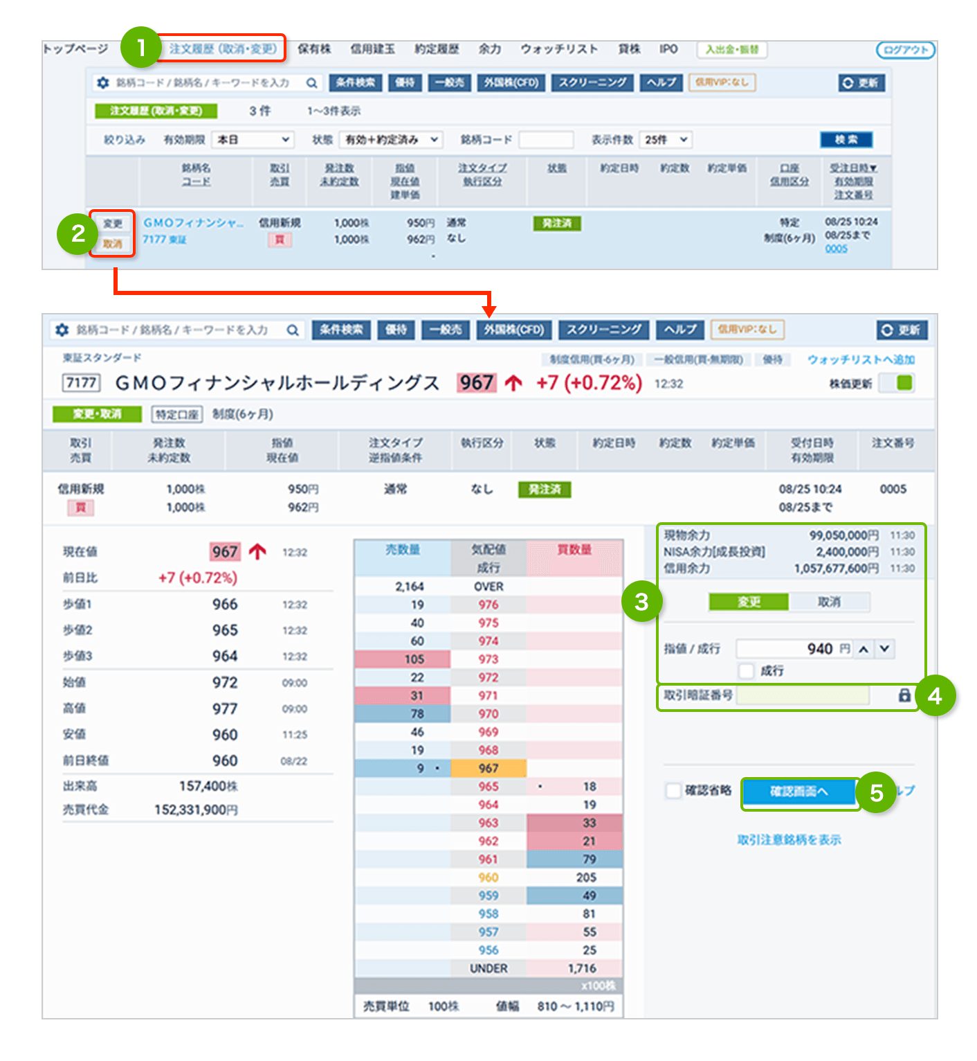 | 対象の銘柄の、注文履歴の「変更」または「取消」をクリックします。 | |