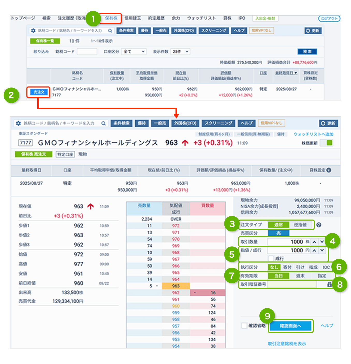 | 保有株一覧から銘柄を選択し「売注文」ボタンをクリックすると、保有株売注文画面が開きます。 | |