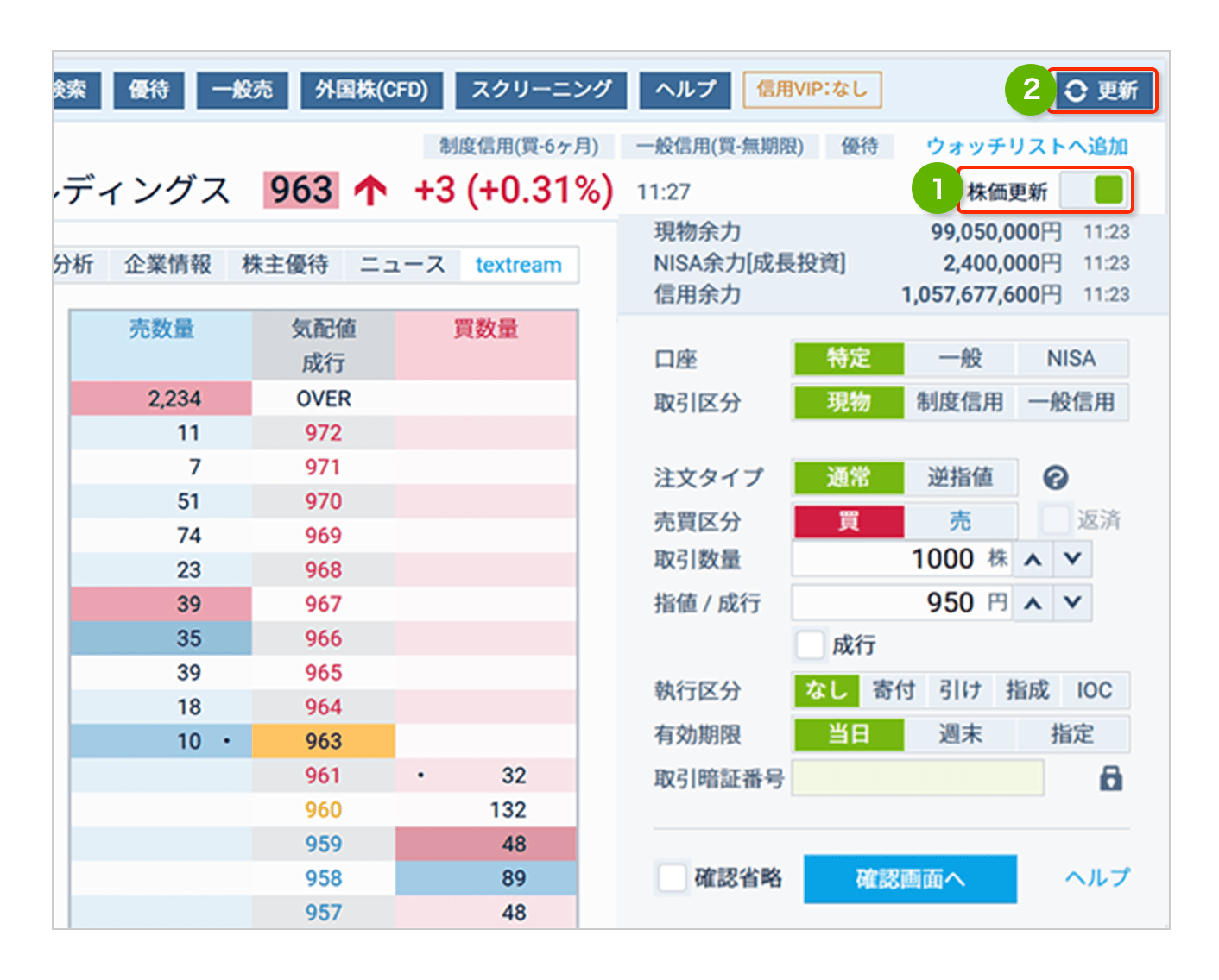 | 注文パネル上部の[株価更新ボタン]をONにすると、株価を自動更新することができます。 ※デフォルトはOFFです。 ※自動更新をONにできるのは2タブまでです。 |
