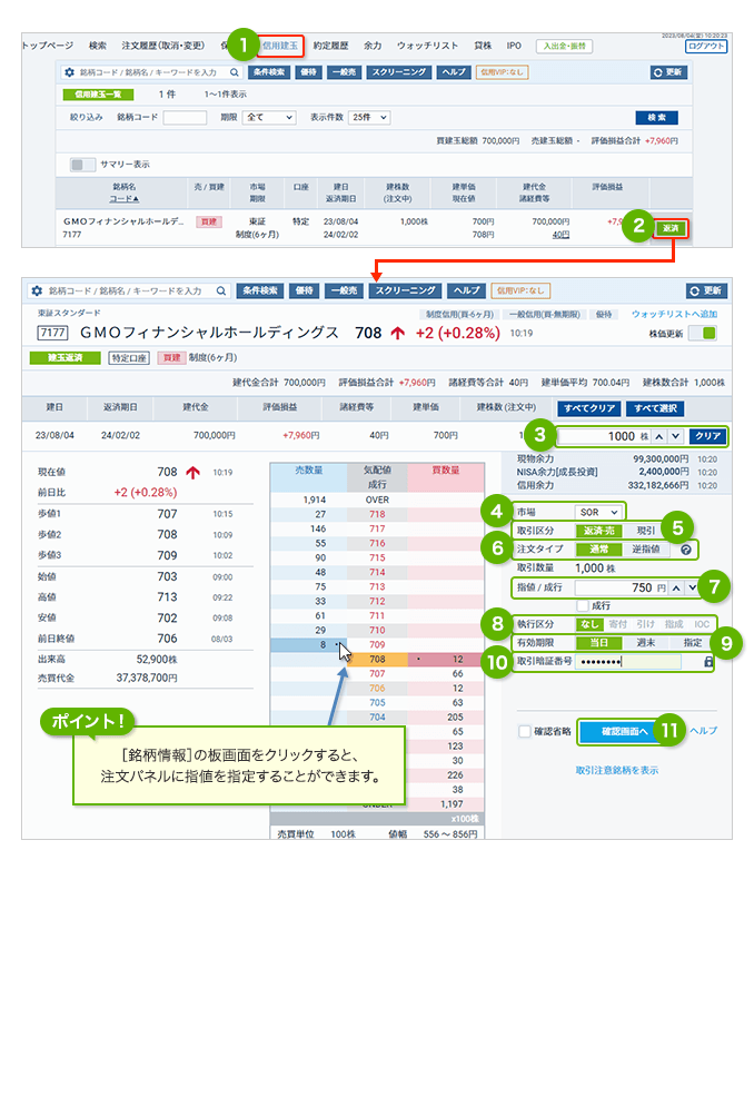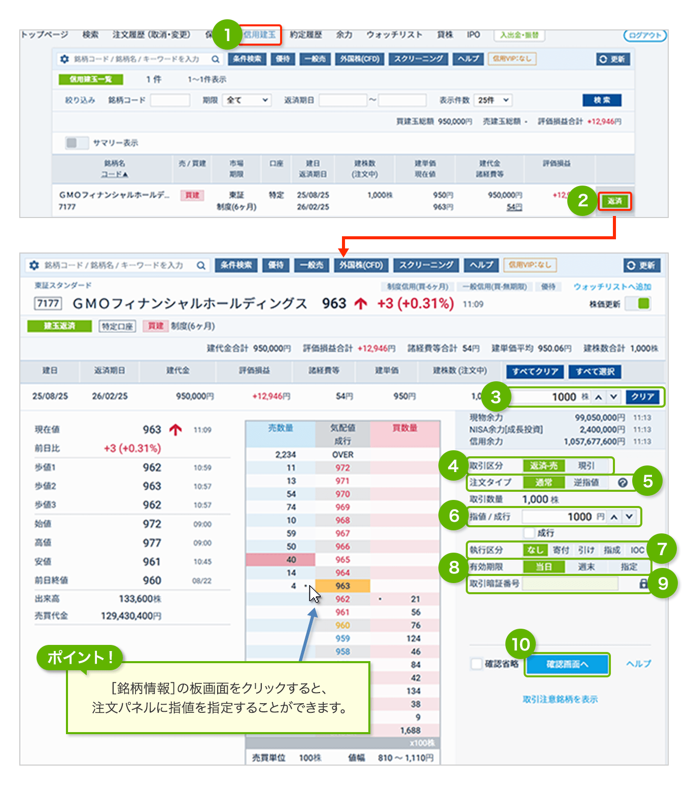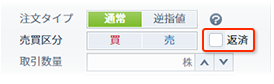 | 信用建玉一覧から銘柄を選択し「返済」ボタンをクリックすると、建玉返済注文画面が開きます。 | |
