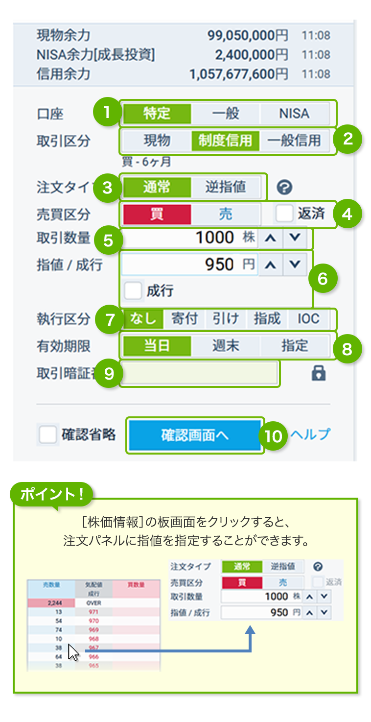 | 指値条件を入力します。成行きの場合は、「成行」にチェックをいれてください。 逆指値の注文方法はこちら |