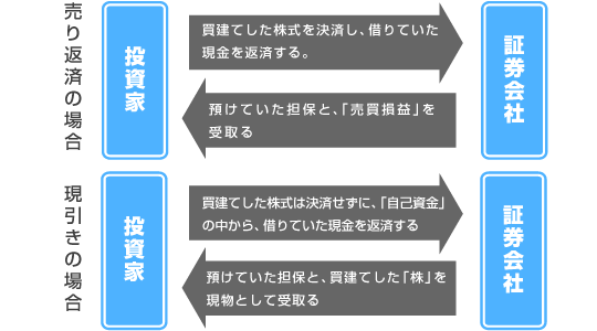 一方、現渡は「品渡し」とも呼ばれ、信用の売りを決済するときに、買い戻して株券を作るのではなく、もともと保有していた現物株式の中から、借りていた株券を返済し代金を受け取る決済方法のことです。