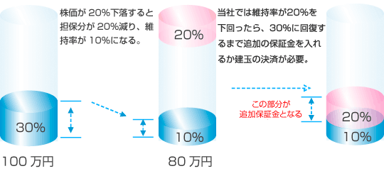 追加保証金が発生した場合には、この状態を解消する必要がありますので、期限までに規定された額に達するまで当該追加保証金を入金するか建玉を決済する必要があります。建玉の一部を決済した場合は、決済建玉の20%相当額を追加保証金(追証)より控除できます。 追加保証金が発生すると、その後株価の値上がり等により委託保証金率が30%(又は委託保証金が30万円)を回復した場合でも、当該追加保証金の入金か建玉の決済が必要となります。